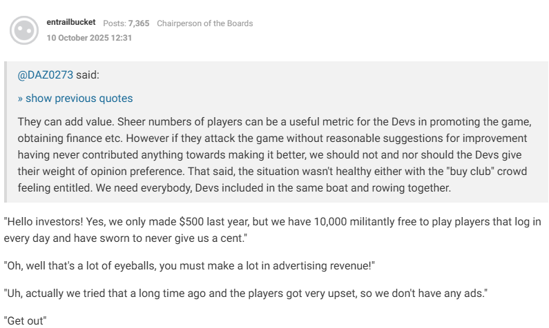 They can add value. Sheer numbers of players can be a useful metric for the Devs in promoting the game, obtaining finance etc. However if they attack the game without reasonable suggestions for improvement having never contributed anything towards making it better, we should not and nor should the Devs give their weight of opinion preference. That said, the situation wasn't healthy either with the "buy club" crowd feeling entitled. We need everybody, Devs included in the same boat and rowing together.