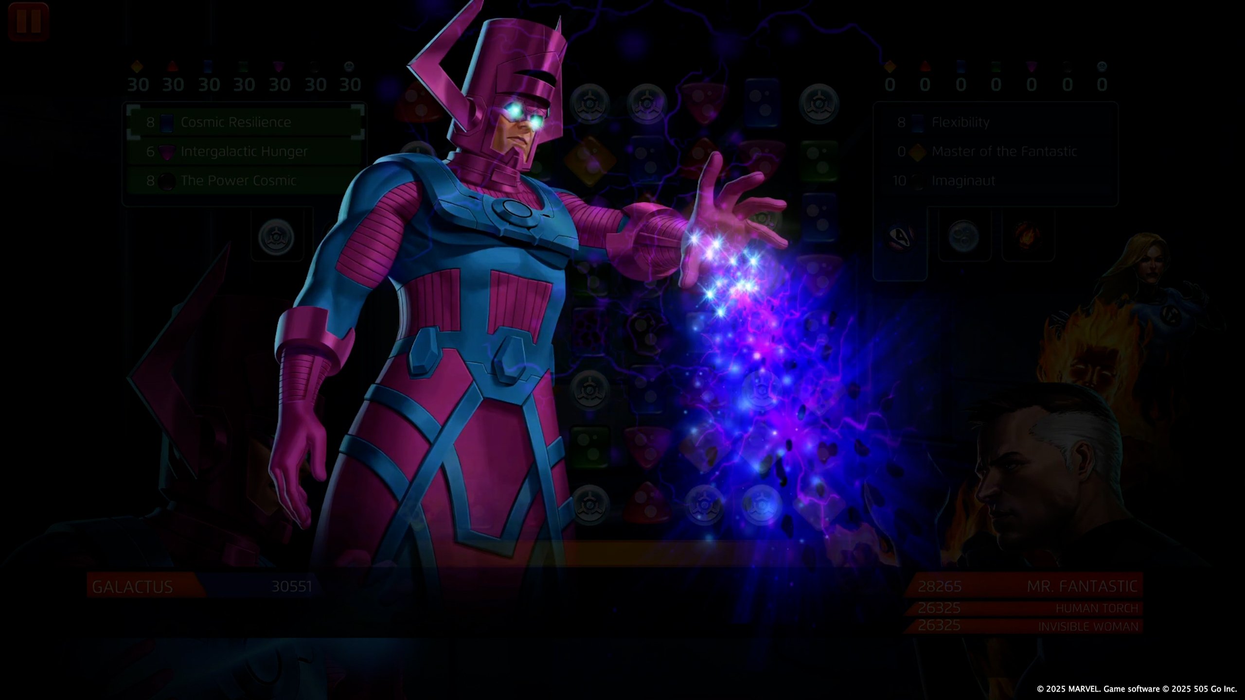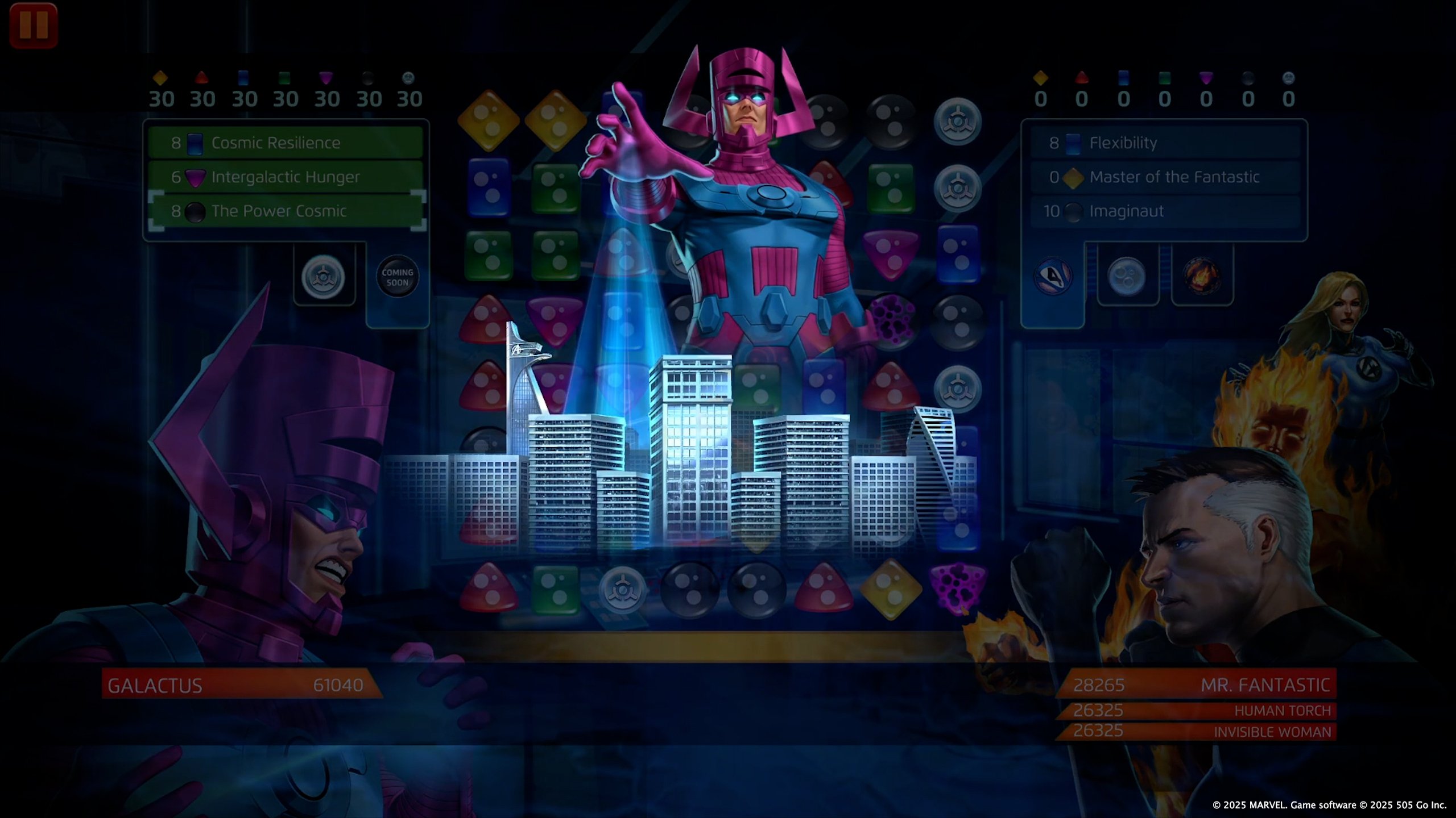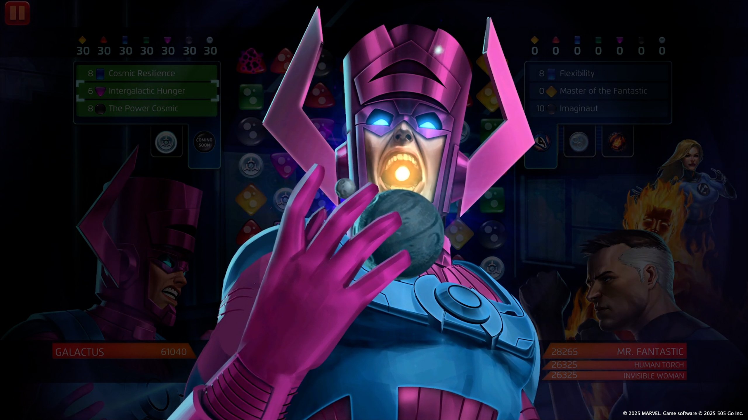 (PASSIVE) At the start of the battle, Create 2 Cosmic tiles. Whenever you match a Cosmic tile, gain 1 AP in each of Galactus’s strongest colors.