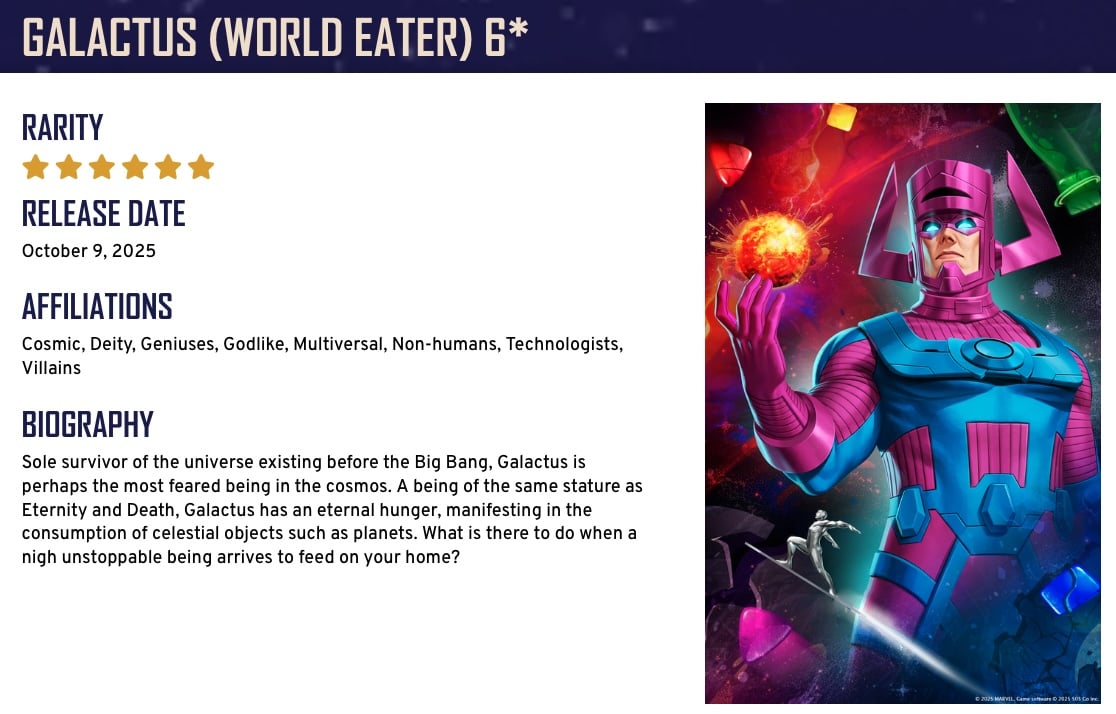 Starting at level 500 and scaling to a maximum of level 700, he establishes a dramatic power gap that defines what players should expect when stepping into the 6-star tier, setting the benchmark for all future releases. Shards for 6-star characters will be available through leaderboard rewards, targeted offers, and high-SCL (9 and 10) PVE play, making Galactus a true chase character befitting his enormous stature in the new Marvel Puzzle Quest meta.