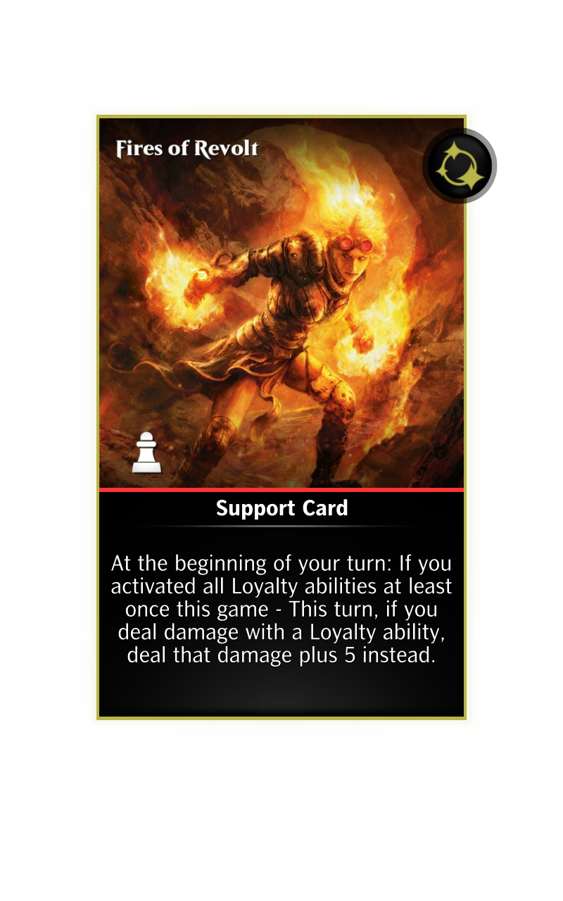 Passive ability - Fires of Revolt: At the beginning of your turn: If you activated all Loyalty abilities at least once this game — This turn, if you deal damage with a Loyalty ability, deal that damage plus 5 instead.