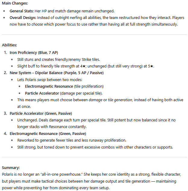 As a little bit of inside baseball, the original balance called for an average of 3 tiles a turn over the course of 10 turns (with some of those tiles being destroyed for proliferation). In actuality, with cascades and real world use, players would have been averaging about 65 tiles over 10 turns. Which never happened since enemies would die well before then. In its new form, she still comes out overbudgeted, but not by much when the fact that players need 5 Purple AP to bring her into this form, and losing the damage that Electromagnetic Resonance would bring into the bargain.