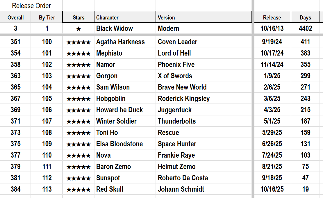What is the rotation looking like? I can't seem to find when sunspot was released. I had previously thought about pulling for Frankie Raye, but sounds like Zemo/Skull might be a good combo.