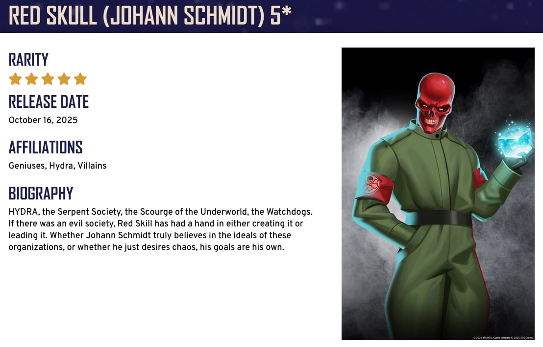 Red Skull (Johann Schmidt) Legendary Token in Placement Rewards, Shards and Event Token in Progression Rewards, Legendary Token and Event Token in Alliance Rewards