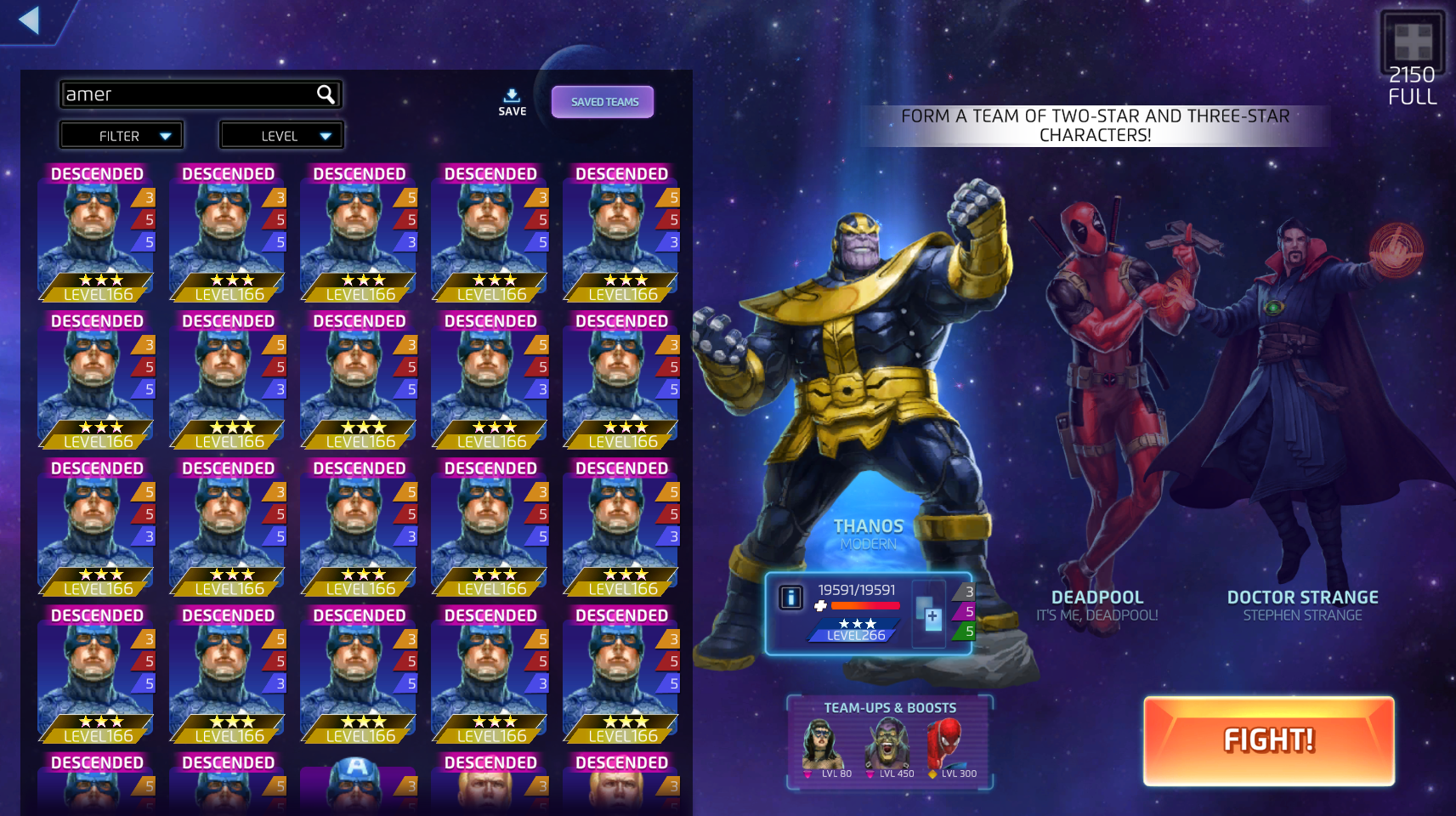 Sometimes when you go to a selection screen, there are multiple instances of the same descended character. I don't actually have that many ascended Captain America 2 star. I have one 2a4 and one 2a5.