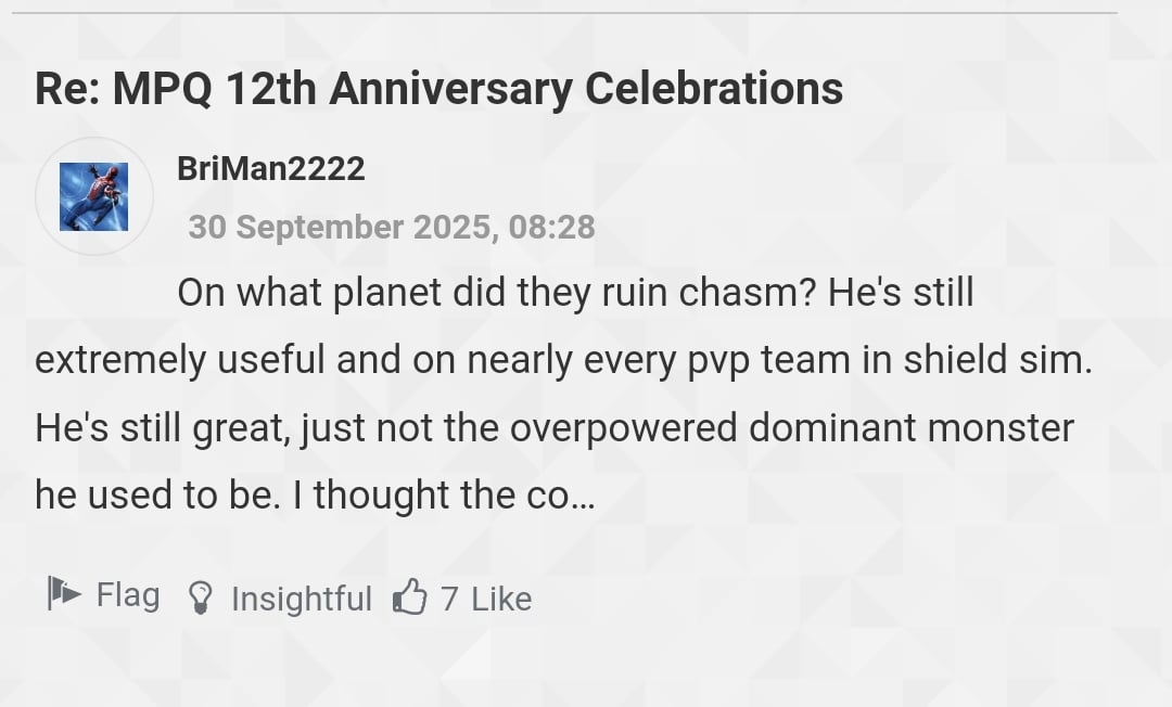 I don't have much hope there. Chasm is the one and only nerf in the history of the game that wasn't crushed by the nerf bat, and he was the new devs first character creation. He was their baby, I'm sure that was a big factor as to why they were gentle with him.