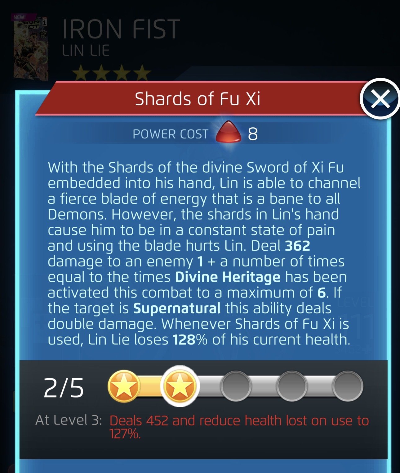 So I am not sure if it’s just me or it’s the same for everyone else but the health loss for using Shards of Fu Xi is 128%. This practically means that he instantly dies whenever he uses it which makes no sense..